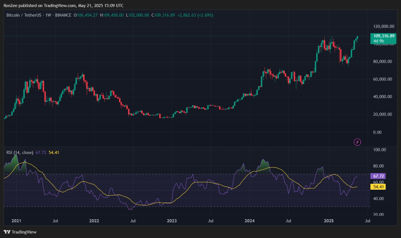 عند الكتابة، كانت BTC تتداول بسعر 108,546 دولار، بزيادة تقارب 4% خلال اليوم. كان مؤشر القوة النسبية الأسبوعي لبيتكوين يبلغ 54.41، مما يشير إلى أنه لا يزال هناك مجال واسع للارتفاع قبل أن تتشكل ظروف الشراء المفرط.