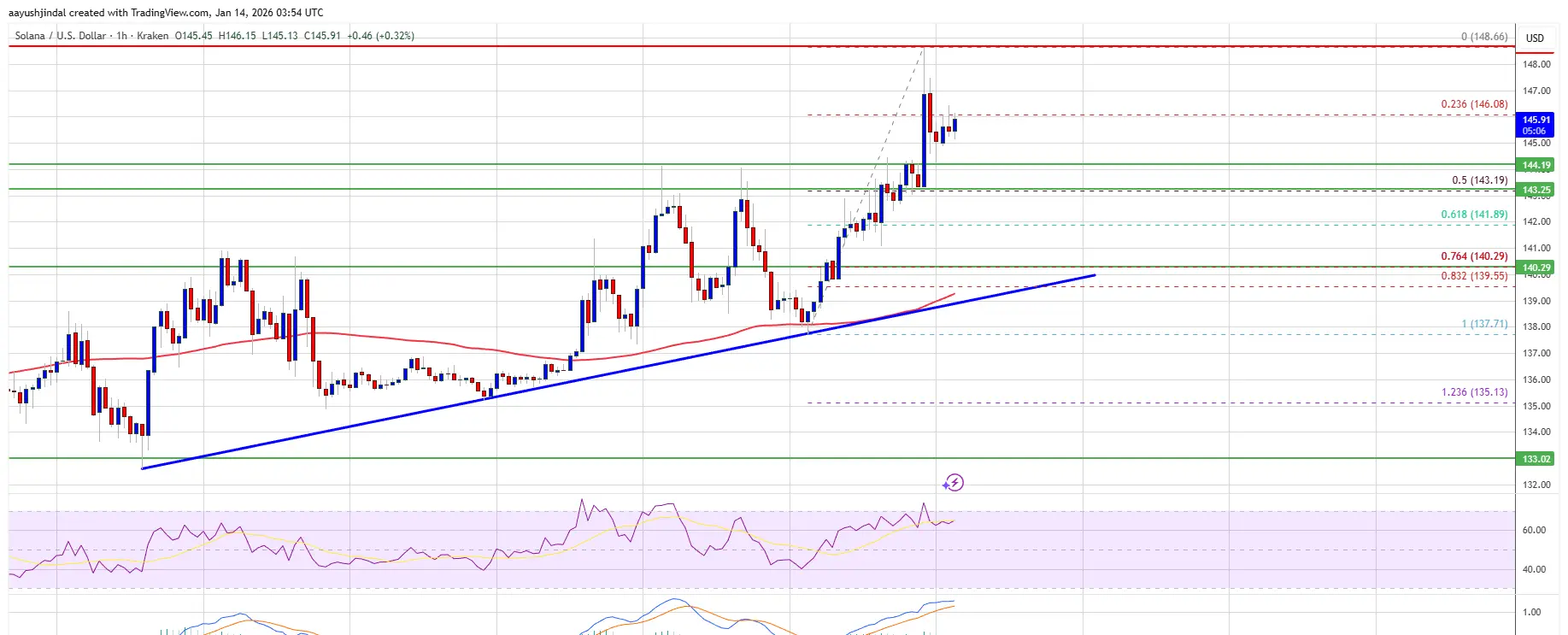 سولانا يتداول الآن فوق $142 ومتوسط الحركة البسيط لمدة 100 ساعة. يتشكل خط اتجاه صاعد مع دعم عند $140 على الرسم البياني للساعة.