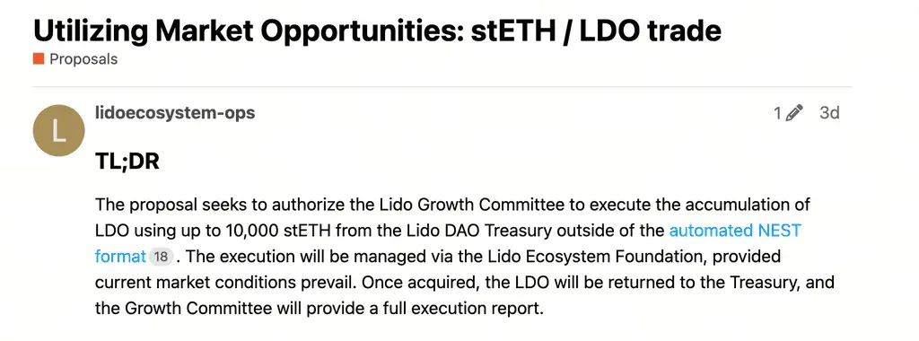 في أواخر مارس 2026، قدمت فريق تشغيل نظام Lido اقتراح حوكمة، الذي يطلب الإذن من لجنة نمو Lido لإنفاق ما يصل إلى 10,000 رمز stETH (بناءً على سعر إيثيريوم الحالي، بقيمة حوالي 20 مليون دولار) لشراء رموز الحوكمة الأصلية LDO في السوق العامة.