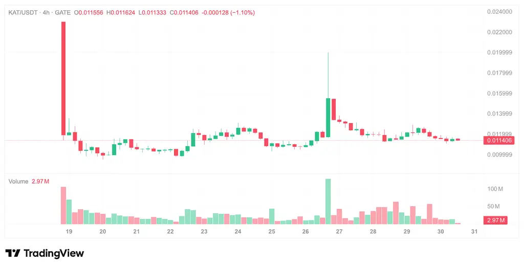 حتى 30 مارس 2026، أظهر أداء كاتانا (KAT) ميزات تصحيح ملحوظة. استنادًا إلى بيانات Gate، كان سعر KAT هو 0.01151 دولار، مع تغير في السعر بنسبة -9.06% خلال الـ 24 ساعة الماضية، وانخفض بنسبة -2.83% على مدى 7 أيام، بينما اتسعت نسبة الانخفاض على مدى 30 يومًا لتصل إلى -15.64%. ومع انخفاض السعر، كان هناك تحول واضح في مشاعر السوق، حيث تشير المؤشرات الحالية لمشاعر السوق إلى “عدم التفاؤل”. كان حجم التداول خلال الـ 24 ساعة هو 1.47 مليون دولار، مما يدل على أن النشاط التجاري لا يزال موجودًا، لكن ضغوط البيع تسيطر.