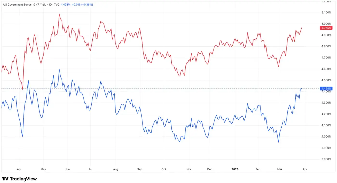 تذبذبت عائدات السندات الأمريكية قبل أن ترتفع، حيث ارتفعت عائدات السندات لأجل 10 سنوات من 4.350% إلى 4.428%، وعائدات السندات لأجل 30 سنة من 4.921% إلى 4.965%، وهو أعلى مستوى منذ يوليو 2025. تعكس هذه المبيعات بيئة الأزمات المتعددة: تصاعد الوضع في الشرق الأوسط والتعريفات التجارية الجديدة على فيتنام وتايوان مما رفع توقعات التضخم، مما دفع المستثمرين إلى طلب علاوات زمنية أعلى. (3)