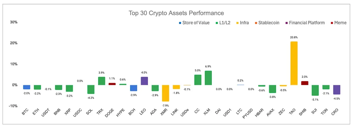 انخفض متوسط أداء أفضل 30 أصلًا بنسبة حوالي 0.01%، حيث كان أداء TAO وXLM وCC بارزًا نسبيًا.