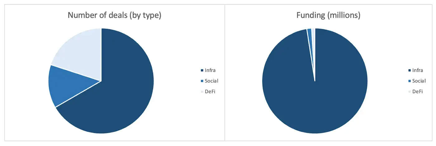 تم إتمام 15 جولة تمويل الأسبوع الماضي، منها 10 في مجال البنية التحتية، تمثل 67%؛ و2 في مجال الشبكات الاجتماعية، و3 في مجال DeFi.