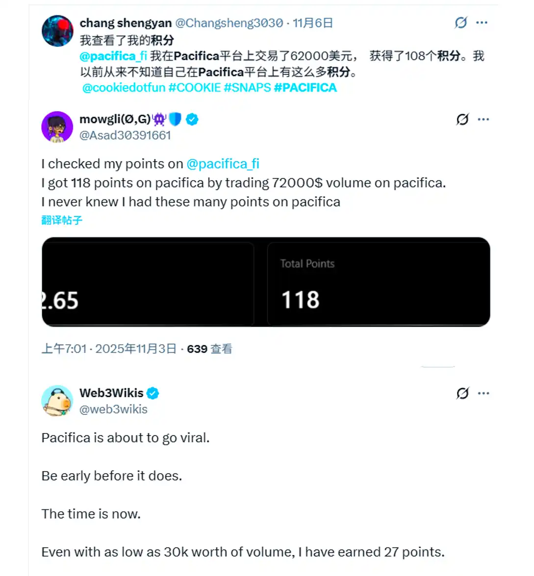 Actualmente, Pacifica cuenta con 30 000 usuarios activos y ha alcanzado un volumen de negociación de 5,9 mil millones de dólares en los últimos siete días. Si bien Pacifica ha crecido con rapidez, su volumen de negociación aún se sitúa por detrás de los principales referentes del sector, Lighter y Hyperliquid, lo que revela un notable potencial de crecimiento. Desde el 30 de octubre, la distribución periódica de puntos en la plataforma se ha multiplicado por veinte, y el suministro actual supera los 135 millones de puntos. Para Pacifica, que aún no dispone de un token en circulación, este sistema de puntos resulta especialmente atractivo para sus usuarios.