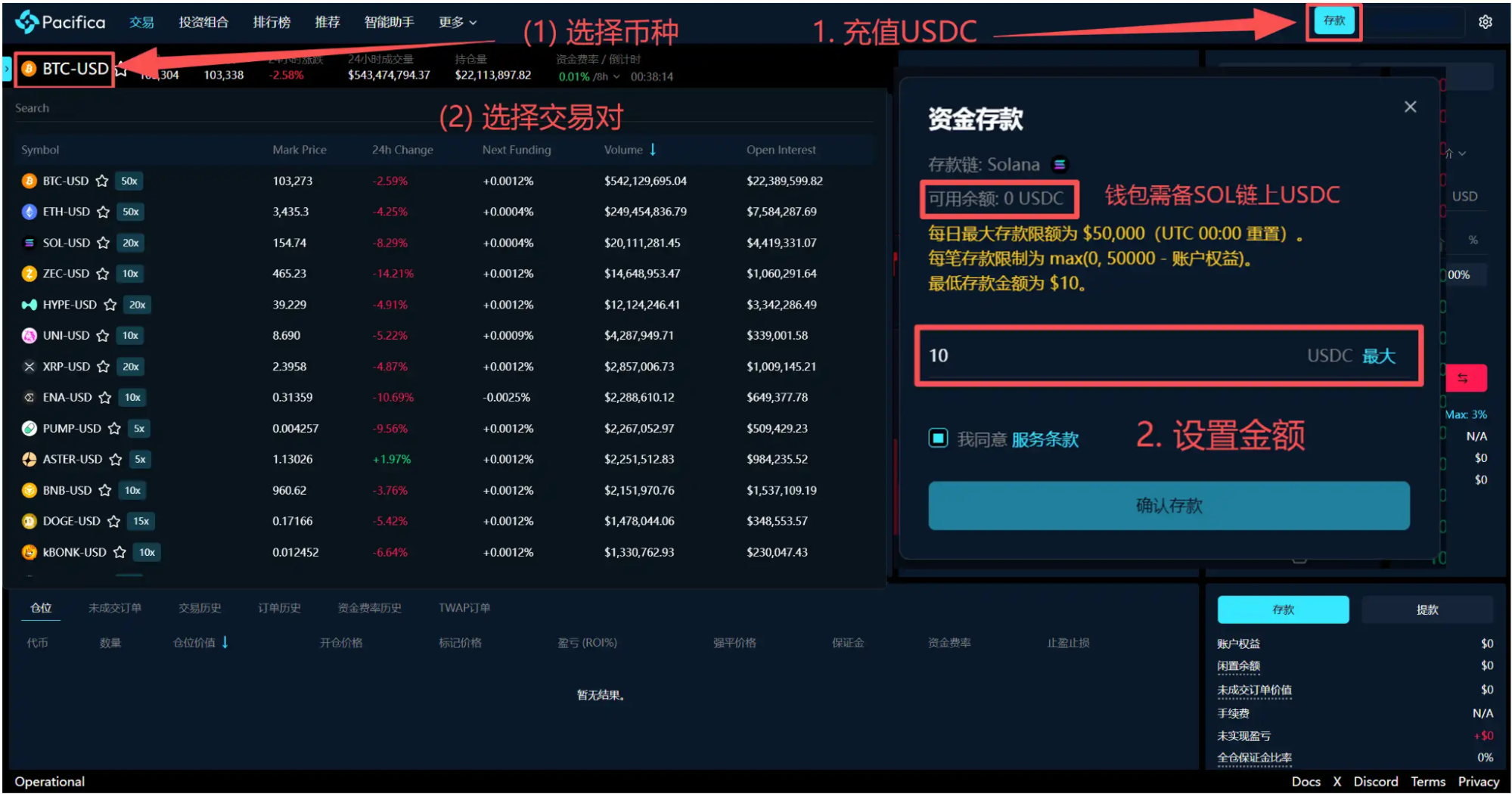 Pacifica funciona sobre Solana, así que elija USDC en la red Solana al depositar. Asegúrese siempre de revisar la dirección de su billetera antes de realizar la transferencia on-chain.