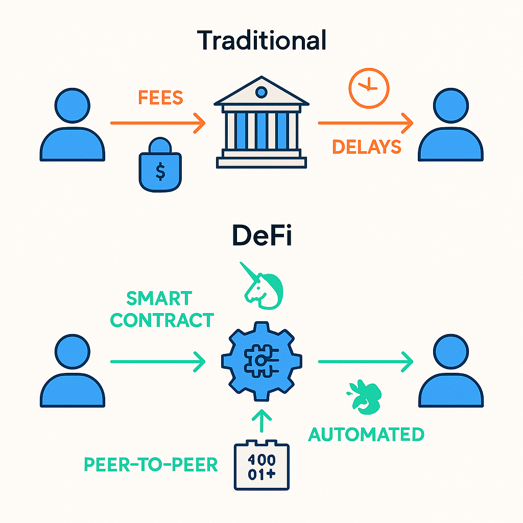 La descentralización puede sonar abstracta, pero ya está afectando a los productos y servicios reales. Casi todas las innovaciones importantes en el espacio cripto se basan en la idea de eliminar a los intermediarios y empoderar a los usuarios directamente. Una de las áreas más vibrantes son las finanzas descentralizadas o DeFi. DeFi se refiere a aplicaciones financieras construidas en redes blockchain que operan sin bancos o brókeres tradicionales. Estos incluyen cosas como exchanges descentralizados (DEX), plataformas de préstamos, servicios de ahorro y rendimiento, protocolos de seguros y más, todos ejecutados por código (contratos inteligentes) que cualquiera puede inspeccionar y usar. En DeFi, normalmente mantiene sus activos en su propia billetera cripto e interactúa con los protocolos financieros directamente en la blockchain; No es necesario depositar fondos en una cuenta bancaria o de corretaje primero. Este modelo peer-to-peer puede ofrecer un mayor acceso y, a menudo, tarifas más bajas, ya que elimina a los intermediarios que normalmente toman una parte o imponen el control de acceso.
