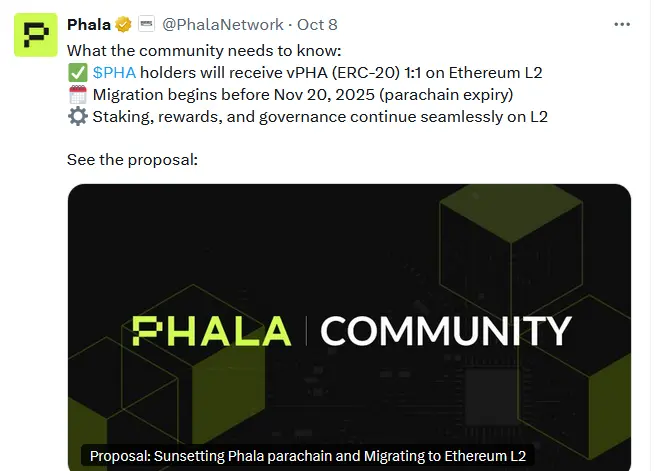 La publicación añade que los poseedores de tokens Phala (PHA) recibirán la nueva variante ERC-20 en una proporción de 1:1, la "migración" comenzará antes del 20 de noviembre, y que "la participación, las recompensas y la gobernanza" continuarán sin problemas en la nueva capa 2 (L2).