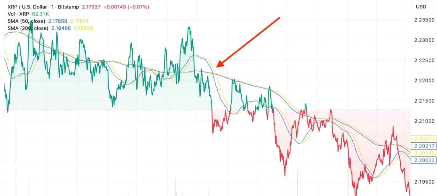 Históricamente, este patrón técnico, que implica que la media móvil simple de 50 días (SMA) cruce por debajo de la de 200 días, ha coincidido con caídas de hasta el 15% para XRP, sugiriendo una posible caída hacia la gama de $1.50, basado en el precio actual de $2.17.
