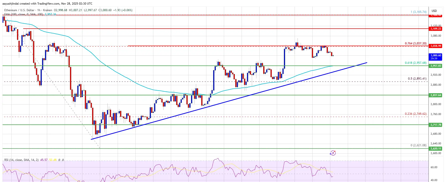 El precio no logró establecerse por encima del nivel de retroceso de Fibonacci del 76.4% del movimiento a la baja desde el máximo de $3,165 hasta el mínimo de $2,620. El precio de Ethereum ahora se está negociando por encima de $2,960 y la media móvil simple de 100 horas. Además, hay una línea de tendencia alcista clave formándose con soporte en $2,950 en el gráfico horario de ETH/USD.