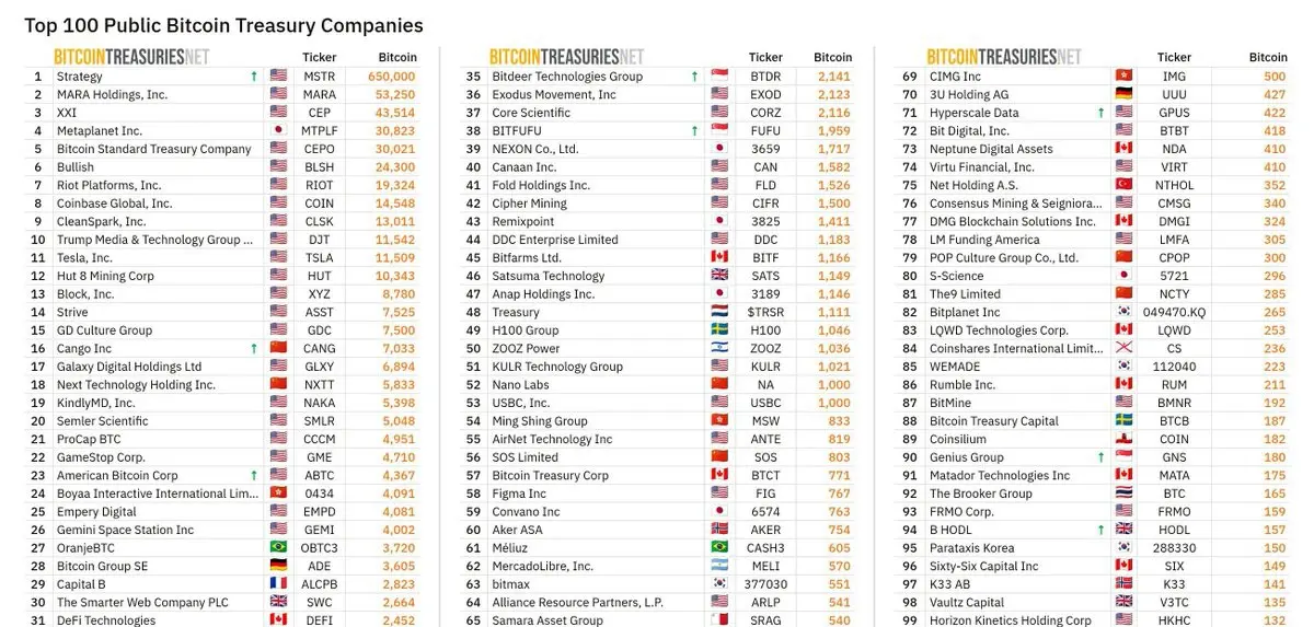 La lista destaca el acelerado cambio institucional hacia Bitcoin como un activo de tesorería a largo plazo, con varias empresas que ahora tratan el BTC como una estrategia central de balance en lugar de una asignación experimental.