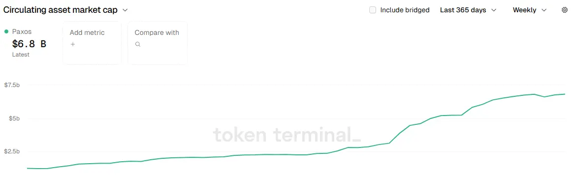 Durante el último año, la valoración total de activos de Paxos ha crecido hasta los 6.8 mil millones de dólares desde solo 1.2 mil millones en enero de 2025, según TokenTerminal.