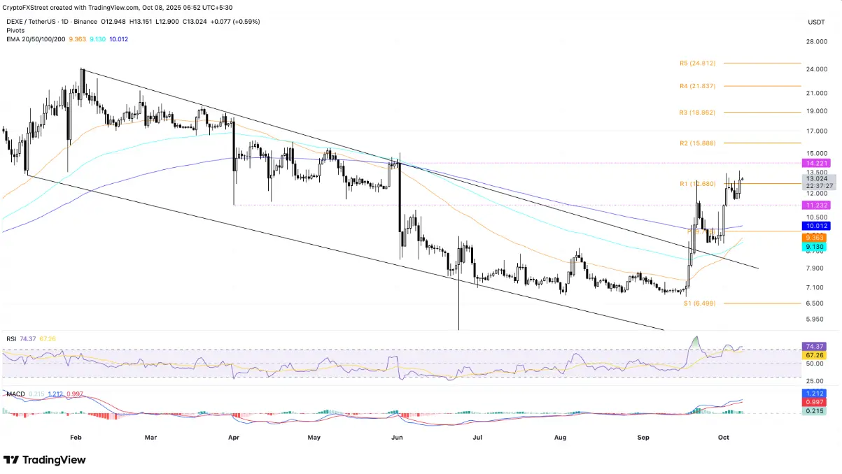 Graphique DEXE/USDT quotidien | Source : TradingViewL'indicateur RSI atteint 74, indiquant que DEXE est en zone de surachat, signalant que l'élan haussier pourrait se stabiliser. Cependant, le signal MACD maintient une tendance positive alors que les colonnes histogramme vert continuent de s'élargir, reflétant que la demande fondamentale continue de soutenir le prix.