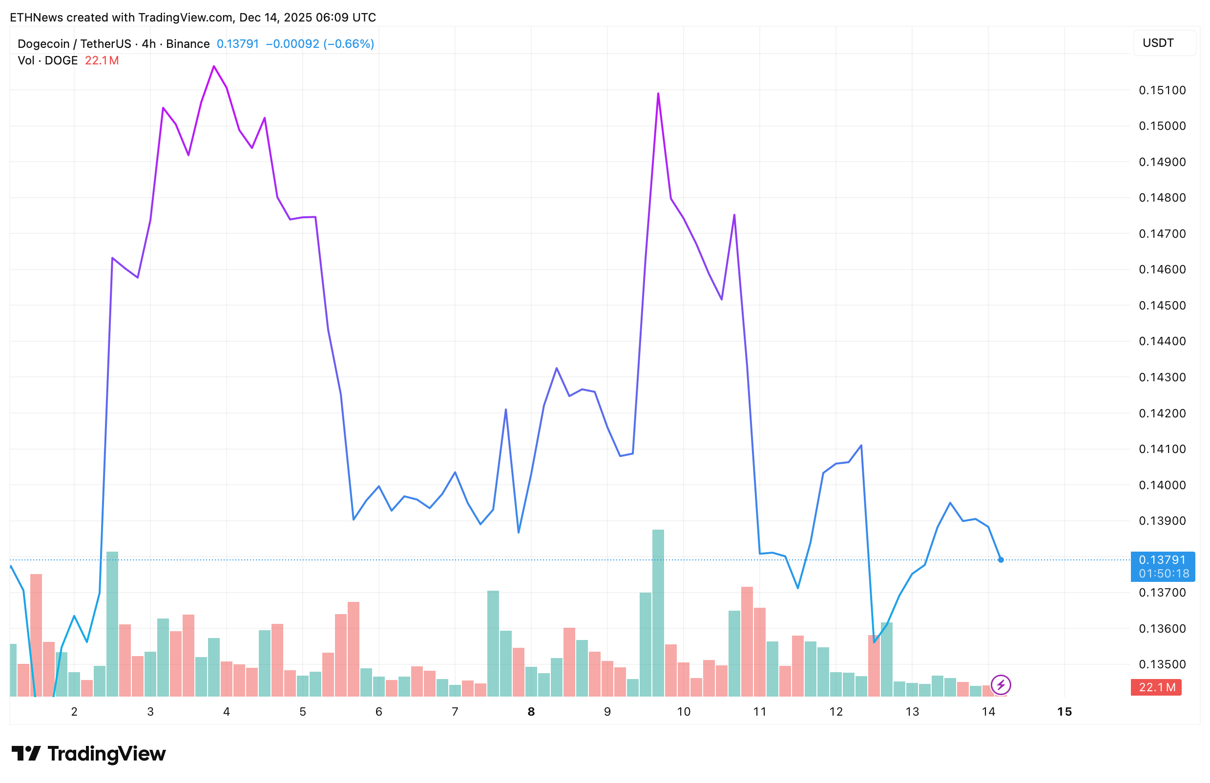 Le graphique séparé de TradingView sur 4 heures montre une image différente à court terme. DOGE se négocie autour de 0,137 $, avec une volatilité intrajournalière et un volume en baisse à l’approche de la mi-décembre.