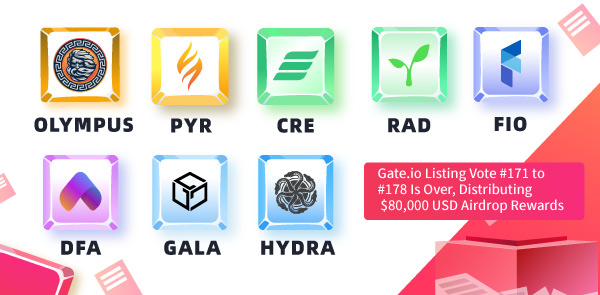 OLYMPUS, PYR, CRE, RAD, FIO, DFA, GALA and HYDRA #Voting for Listing# campaigns completed and these tokens have been successfully listed on Gate. We have rewarded users with token airdrops, enabled trading and withdrawal services.