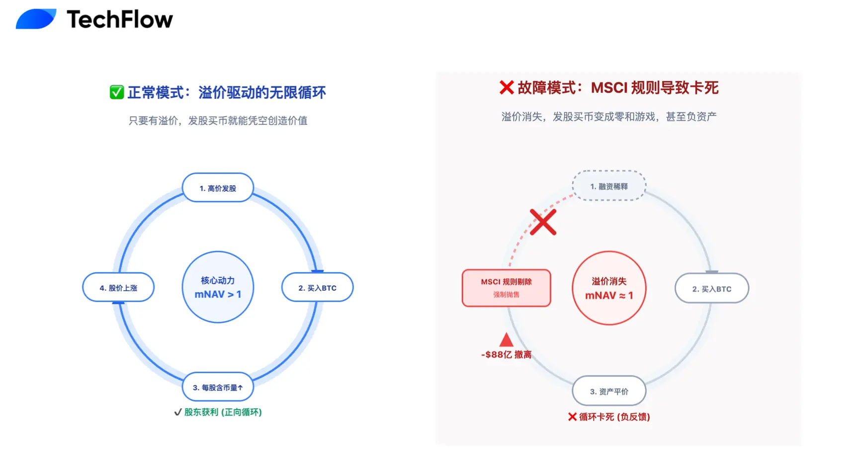 Model sebelumnya adalah: menerbitkan saham → membeli Bitcoin → harga saham naik (karena ada premi) → lalu terbitkan lebih banyak saham lagi. Sekarang preminya hilang, menerbitkan saham untuk beli koin jadi permainan zero-sum.