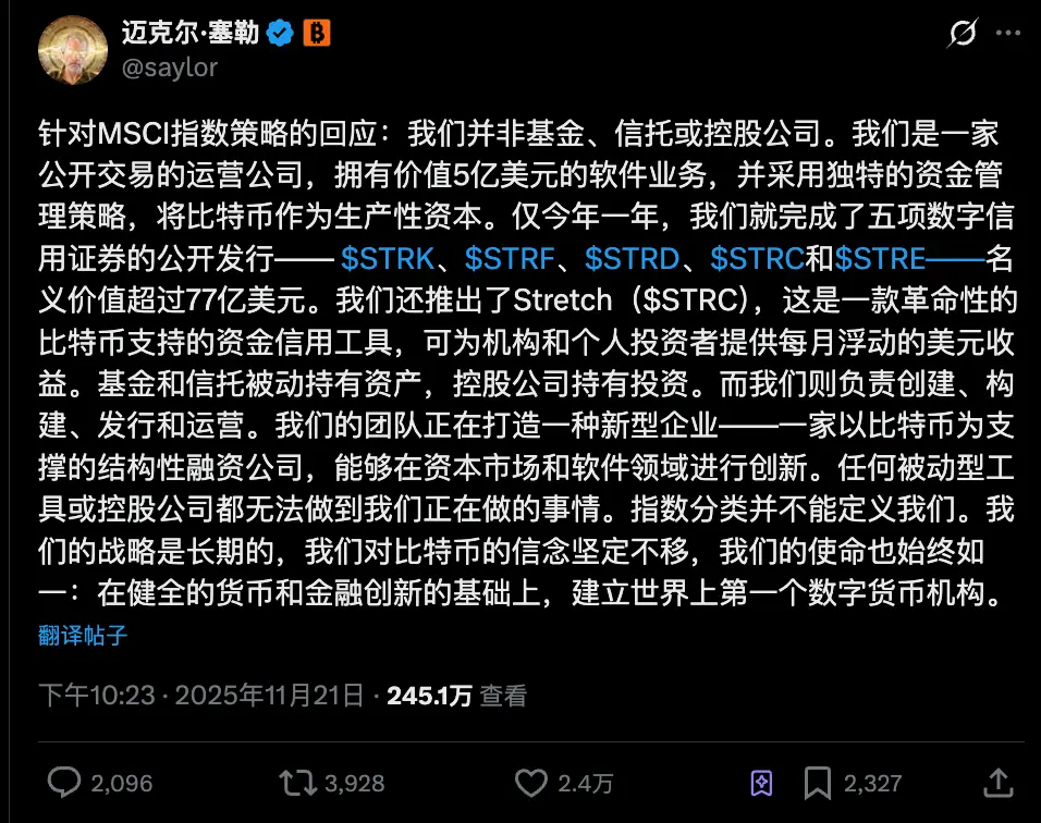 Pada 21 November, dia menulis panjang di X, inti pesannya: MicroStrategy bukan fund, bukan trust, juga bukan holding company. Dengan seni bahasa, dia menghindari penetapan MSCI:
