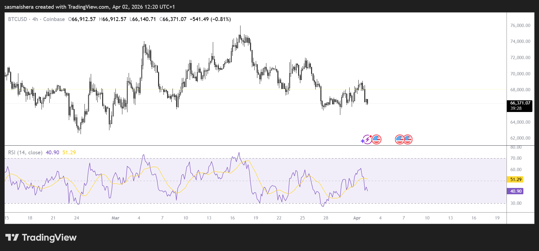 Grafik BTC/USD 4 jam bersifat bearish dan efisien karena pada hari Kamis Bitcoin diperdagangkan di bawah $66.400, menghapus pemulihan dari awal pekan ini. Bias jangka pendek sedikit bearish.