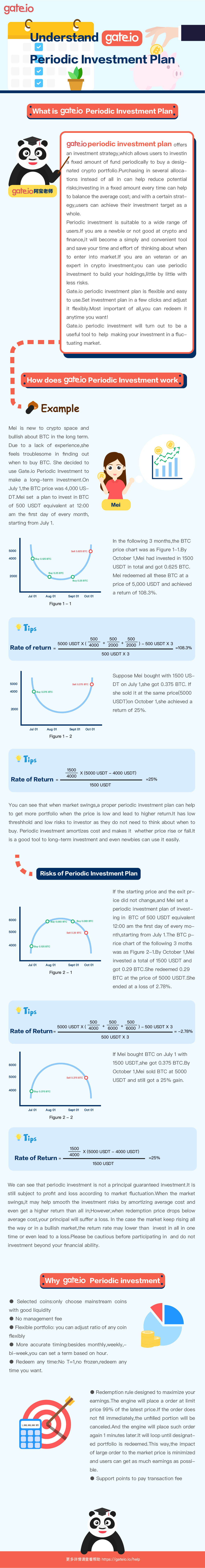 Gate is committed to providing a safe trading environment and all-around digital asset management services. Currently, Gate has launched a variety of asset management tools, such as margin trading (principal-guaranteed) and FIAT trading (principle-guaranteed), etc. We are now introducing Gate Periodic Investment Plan (not principal-guaranteed), which enables users to purchase digital currency in a stable manner. Traders can maximize their gains by creating diversified investment portfolios using the various asset management tools we provide.