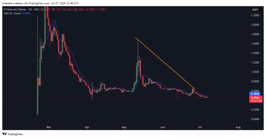 5月に一時1.40ドル付近まで急騰した後、Pi通貨は再び持ちこたえることができませんでした。その期間の下落トレンドラインは、Pi通貨の上昇を常に制限し続けました。価格が0.50ドルとトレンドラインを突破しない限り、ショートポジションが依然として支配的であるでしょう。