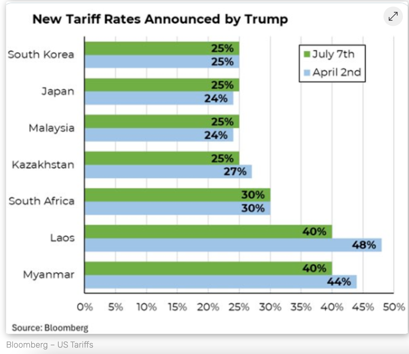 XRPの運命がSECの手に握られているとき、アメリカの関税動向はビットコイン(BTC)の需要に影響を与えました。トランプ大統領は貿易信函を発表し、「解放日」(4月2日)レベルの関税を再実施しました。Tolou Capital Managementの創業者スぺンサー・ハキミアンが共有したブルームバーグのチャートは、最新の関税と「解放日」の関税の類似性を浮き彫りにしています。