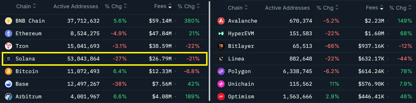 このトレンドの下落は、Solanaが周期的な活動の減速だけでなく、構造的な競争圧力にも直面していることを示しています。