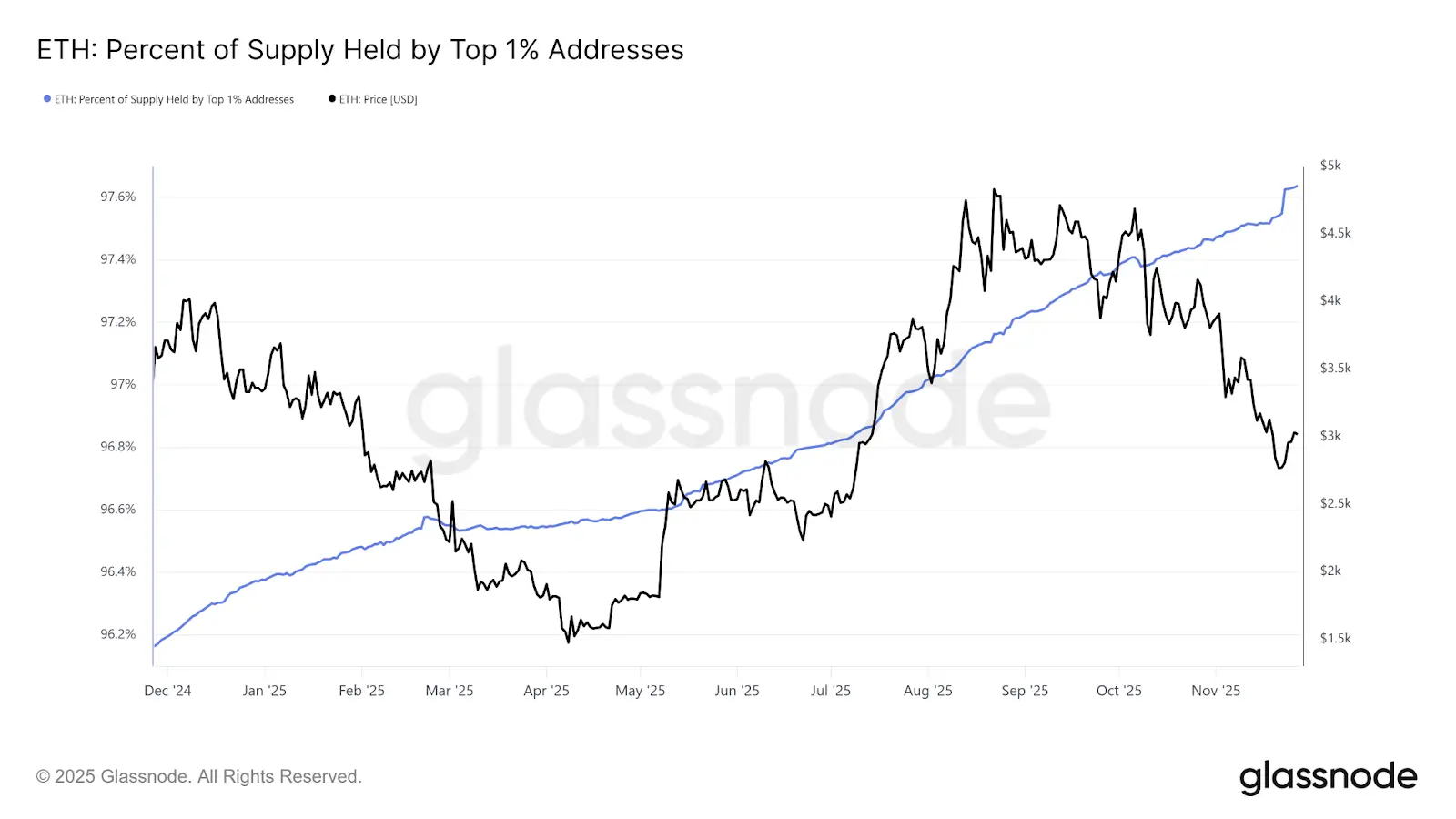 ブロックチェーンデータプラットフォームGlassnodeによると、上位1%のアドレスが保有するエーテルの供給量は水曜日に97.6%に上昇し、1年前の96.1%から増加しました。
