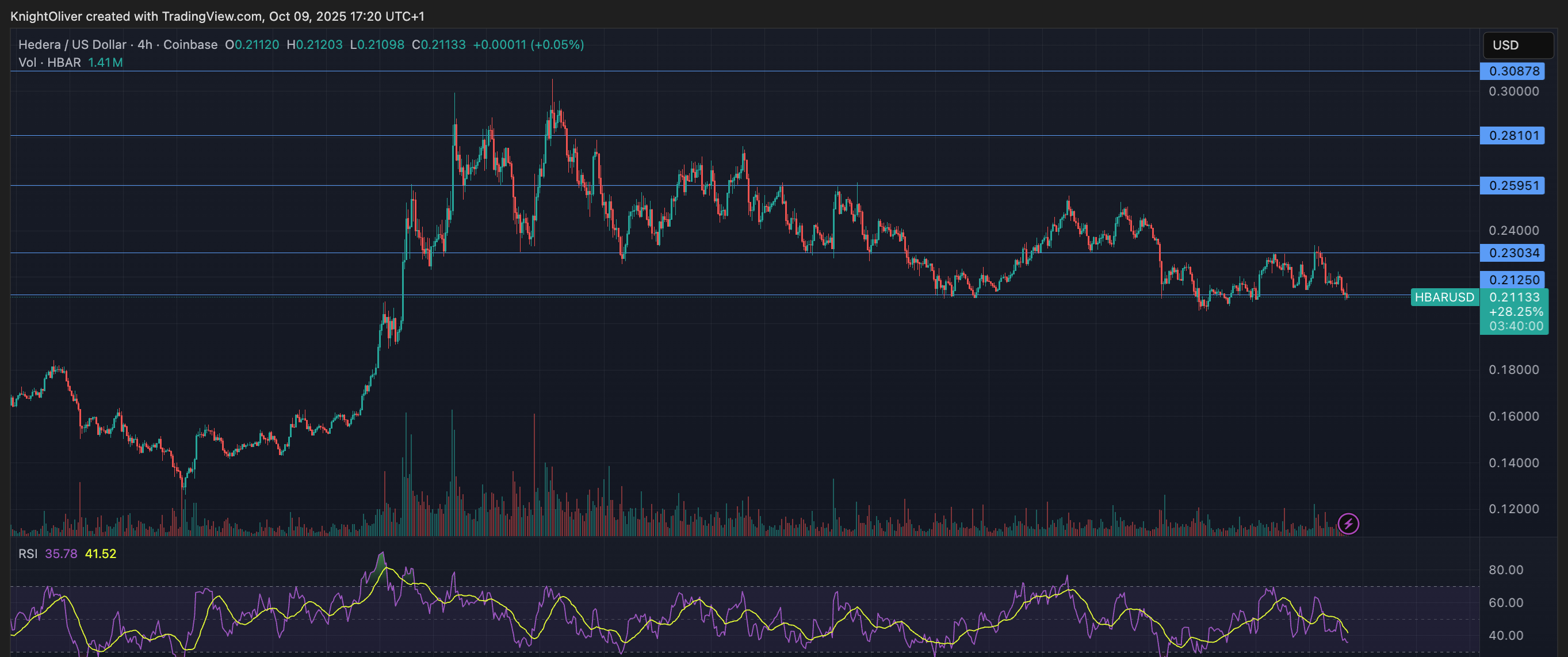 ヘデラ・ハッシュグラフのHBARトークンは、10月8日から9日にかけて$0.22から$0.21にほぼ5%下落しました。これは、進行中の規制の不確実性の中で機関投資家の慎重さが深まったためです。ボラティリティは5.4%急騰し、10月9日の01:00から08:00の間に重い売却が行われ、出来高は1時間あたり1億ユニットを超えました。アナリストは、$0.22で強い抵抗があり、$0.21付近に機関のサポートがあることを重要なテクニカルレベルとして挙げました。最終時間では、HBARがさらに0.85%下落し、$0.212となる中で、加速する損失が見られました。$0.215での短い回復試みはすぐに失敗し、取引出来高は終盤の数分間でゼロに崩壊しました---これは技術的な問題か、完全な機関投資家の撤退を示唆しています。売却は、米国政府のシャットダウンがSECの業務を停止し、ETFの承認を遅延させる中で、より広範な市場の不安を反映しています。Canary CapitalのHBARおよびLitecoinのETF申請は保留中であり、あるプラットフォームは競争力を維持するためにSolanaのETF手数料を引き下げ、ステーキングを追加しました。規制の明確さが戻るまで、企業の財務はデジタル資産へのエクスポージャーに対して慎重であると予想されます。HBAR/米ドル (TradingView)