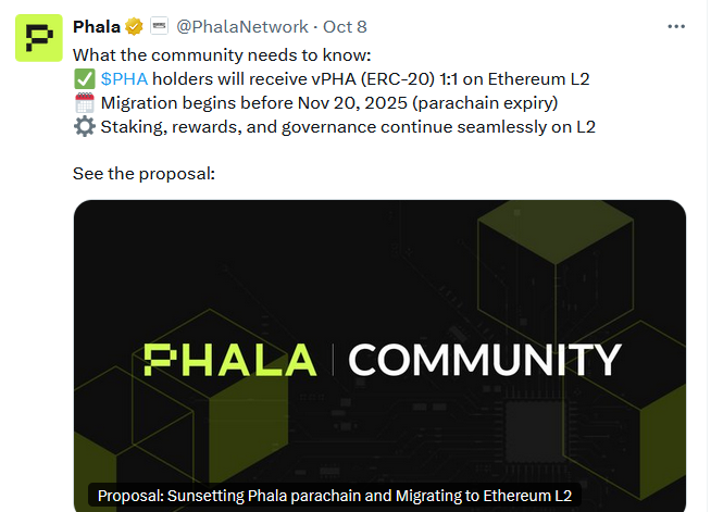投稿は、Phala (PHA)のトークン保有者が新しいERC-20バリアントを1:1の比率で受け取ること、"移行"が11月20日以前に始まること、そして"ステーキング、報酬、ガバナンス"が新しいレイヤー2 (L2)でシームレスに続くことを追加しています。