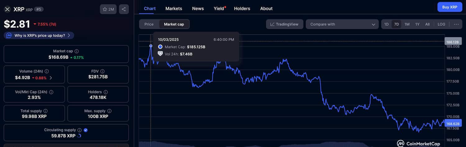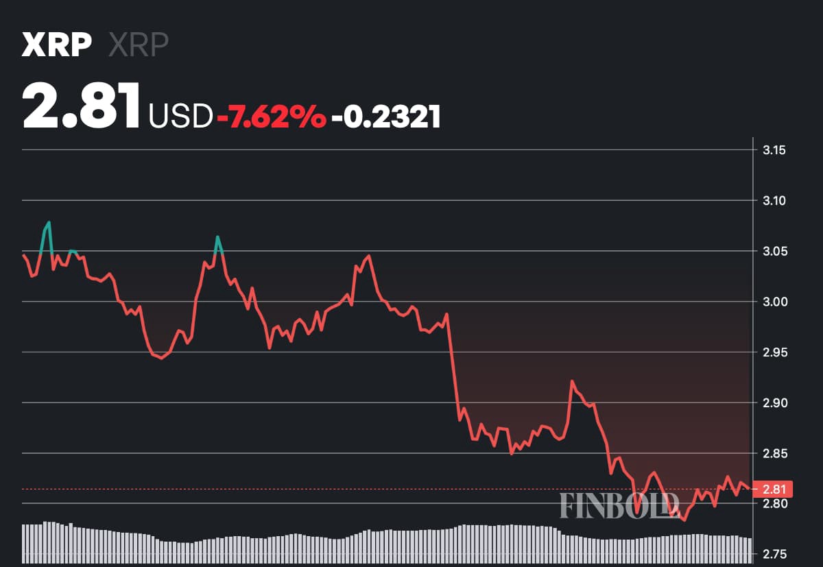 この下落は、XRPの価格を$2.81に押し下げた7%の週間減少を反映しており、より広範な暗号市場が比較的安定している中でのことです。