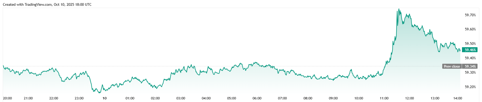 24時間の取引量は6.48%増加し、7709億ドルに達し、市場資本は2%減少して2.35兆ドルとなりました。しかし、ビットコインのドミナンスは、報告時点で0.17%上昇し、59.46%に達しました。