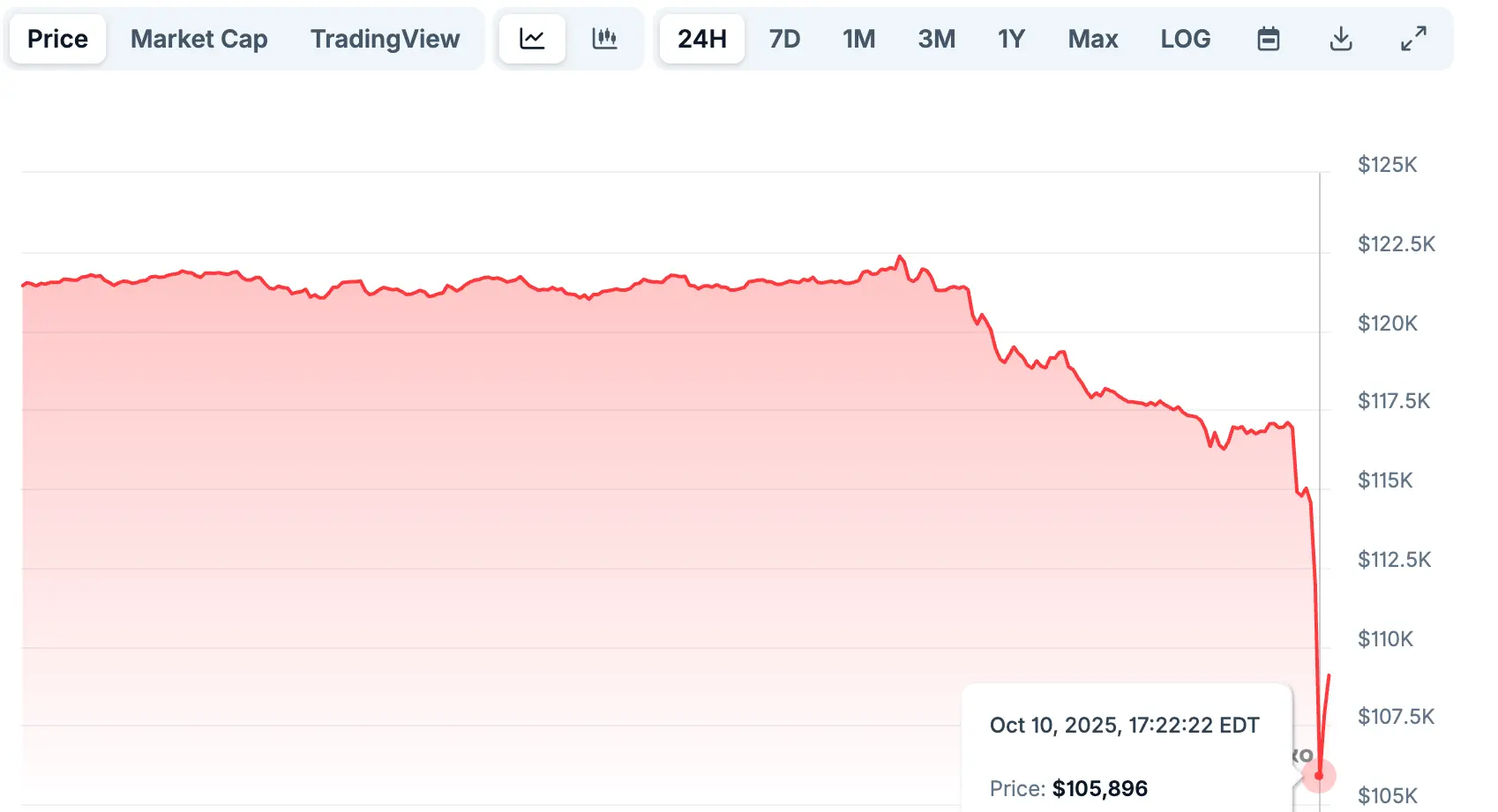 金曜日の夕方、広範な暗号市場が下落し、ビットコイン(BTC)は$108,000を12%下回り、イーサリアム(ETH)は$3,600を17%下回るというリスク回避の感情が再燃しました。