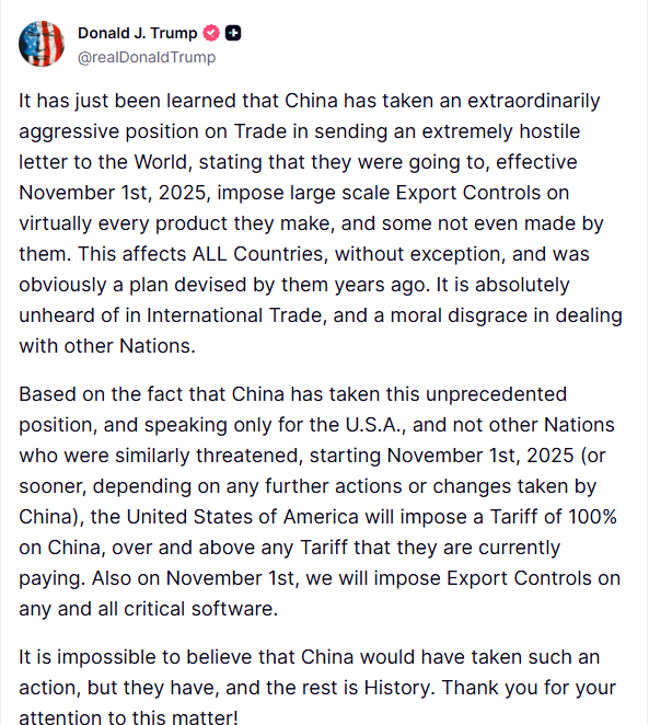 オンラインに掲載された声明で、トランプ氏はアメリカが11月1日からすべての中国製品に100%の関税を課すと述べ、中国が「ほぼすべての製品に対して行っている」と彼が呼ぶ「非常に攻撃的な」輸出管理を課したことを挙げました。