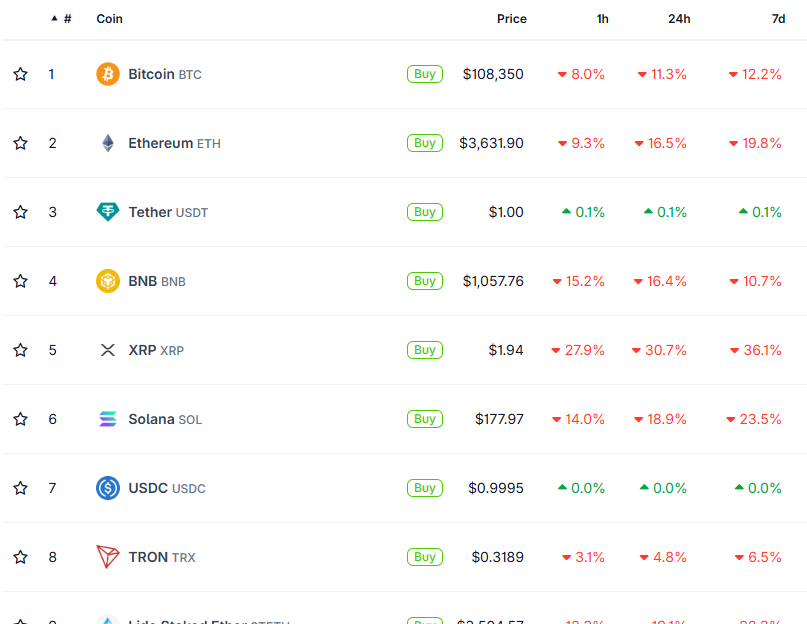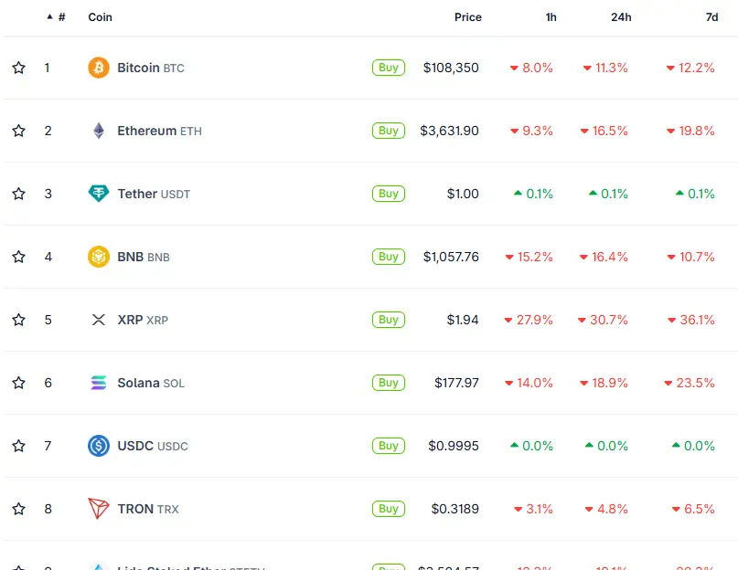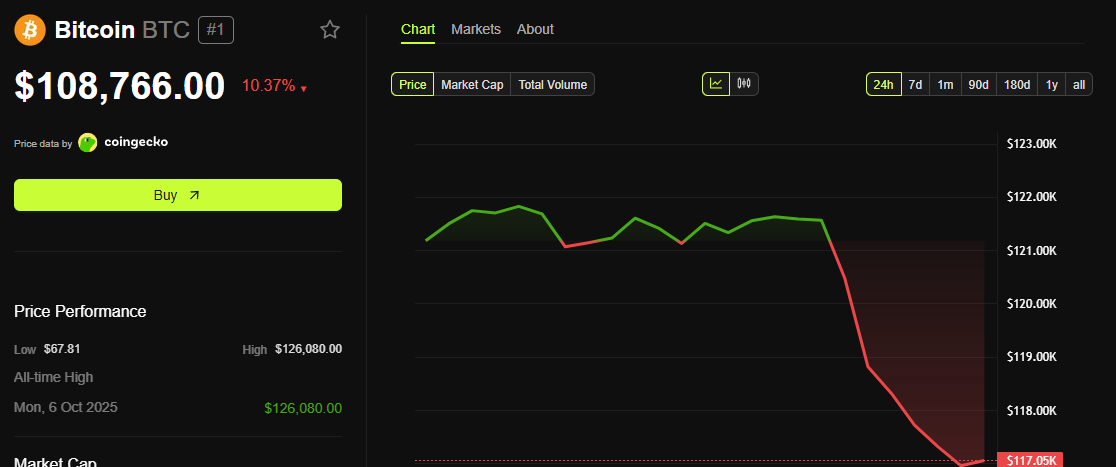 ビットコインは$122,000から$107,000に10%暴落しました。イーサリアム、XRP、BNBは15%以上下落しました。