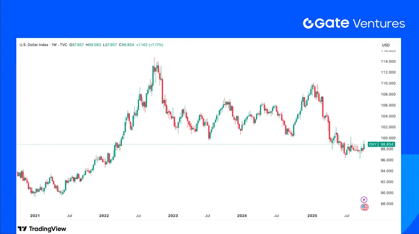 先週の米ドルは強い動きを見せ、木曜日には99ドルを突破し、金曜日には98ドルに戻りました。政府の閉鎖後、米ドルのレジリエンスが顕著になり、市場は連邦準備制度(FED)の利下げが引き続き慎重に行われるとの見方を示しています。(3)
