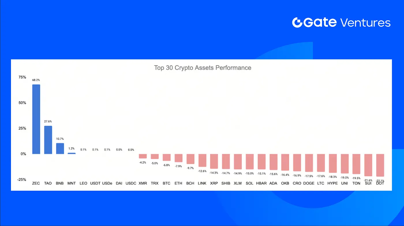 山寨通貨は最も下落し(-14.9%)、しかし Zcash(+68%)、Bittensor(+27%)、BNB(+10%)は逆市で突き抜けた。Zcashは新しいプライバシーウォレットの急速な採用により、「Zashi効果」を引き起こした。