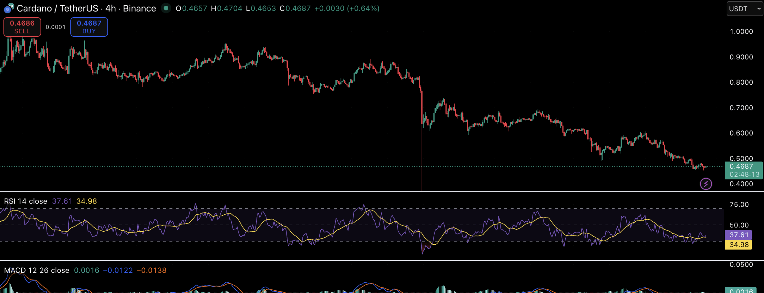 4時間足チャートは解釈を支持しており、ADAはRSIで売られ過ぎゾーンで取引されている一方で、MACDなどのモメンタム指標はフラットになり始めています。