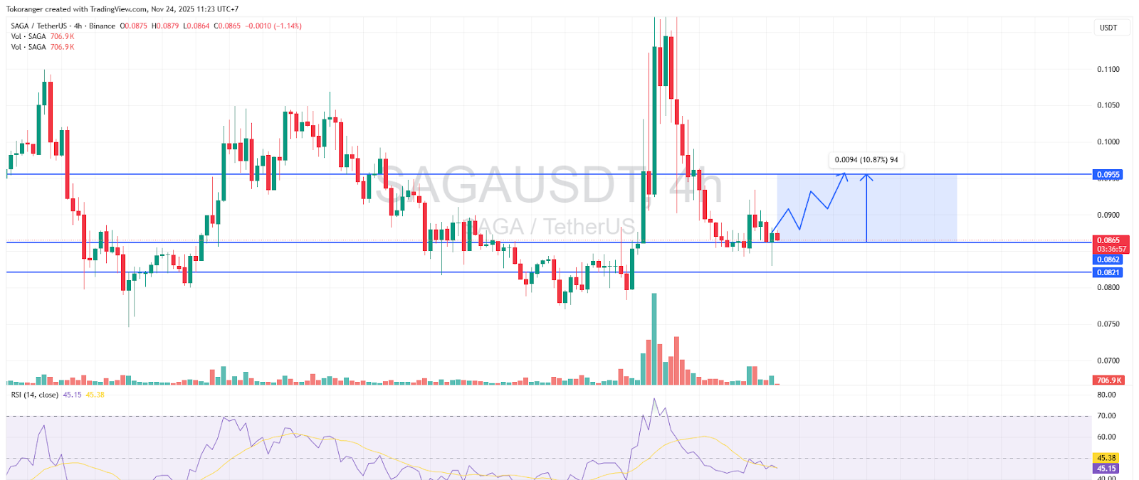 SAGA/USDT現在は、0.0862の出発点を再テストしている「旅行ルート」のように動いており、価格が「安全ゾーン」0.0821をストップロスとして維持されている限り、0.0955の「目的地」に向かう可能性があります。価格構造はまだ横ばいで、小さな高値パターンがあり、RSIは45の範囲にあります。これは、買いの力が回復し始めていることを意味しますが、まだ積極的ではありません。