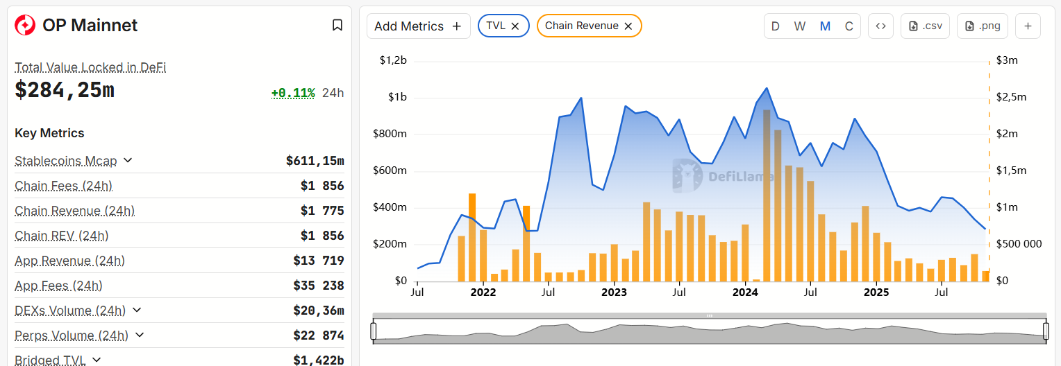 OP Mainnetの月間収益はTVLに対するものです。ソース: DefiLlama