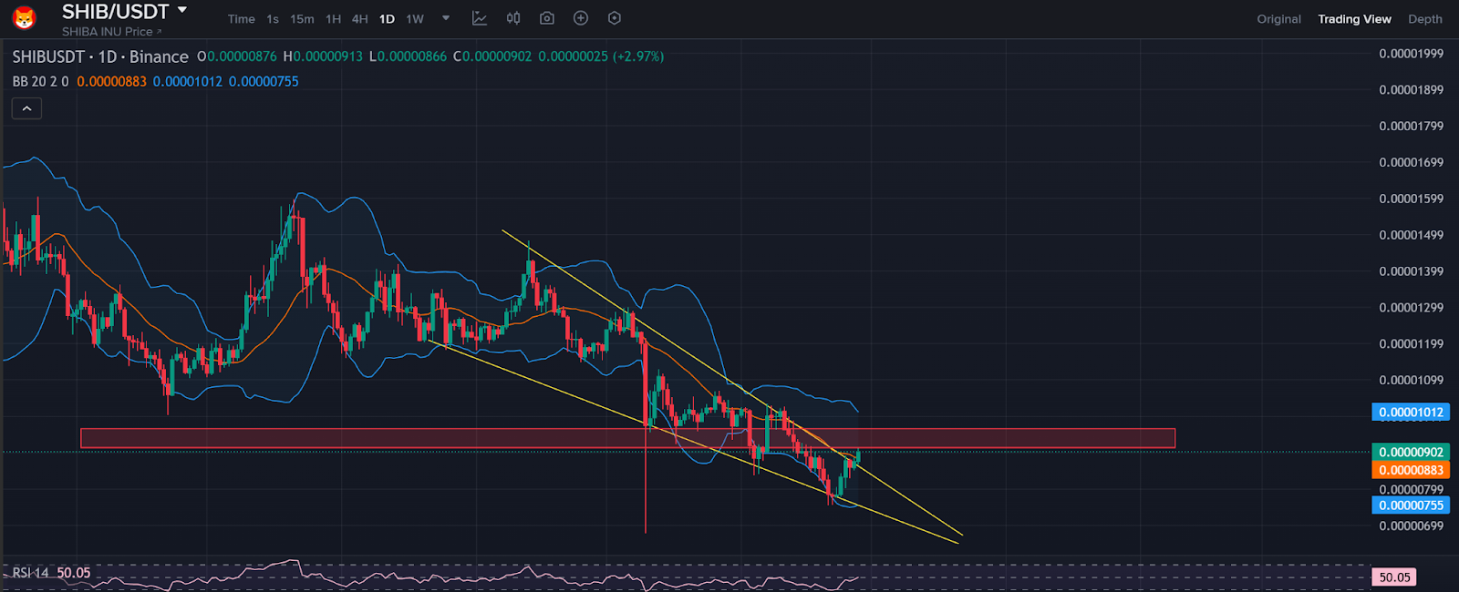 SHIBの価格チャートは強気のフォーリンウエッジパターンです。