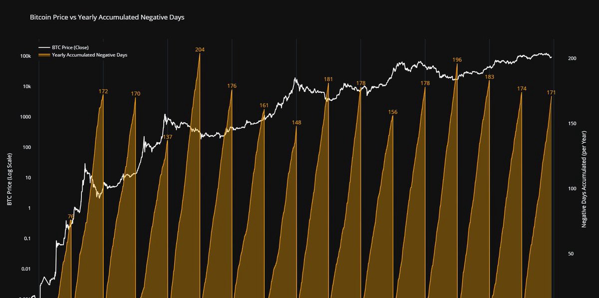 ビットコインの2025年の価格動向は、最も一貫した長期パターンの1つに従っているようです。それは、年間のおよそ半分をマイナス圏で過ごすというものです。アナリストのJoao Wedson氏によれば、ビットコインは2010年以降のすべてのサイクルで、年間平均約170日の陰線(日足終値が前日比マイナス)を記録しています。