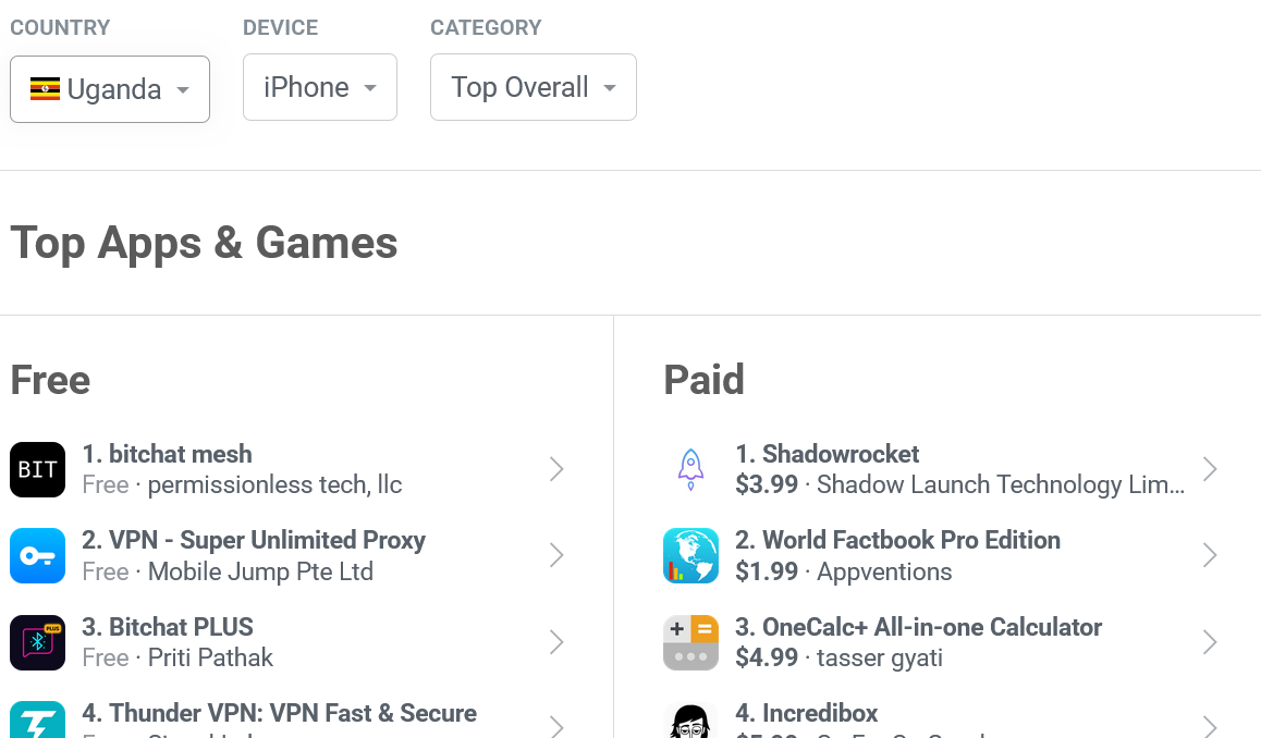 その他のトップアプリにはVPNアプリが含まれ、木曜日の投票が近づく中、情報へのアクセスがウガンダで最も緊急のニーズの一つであることを示している。