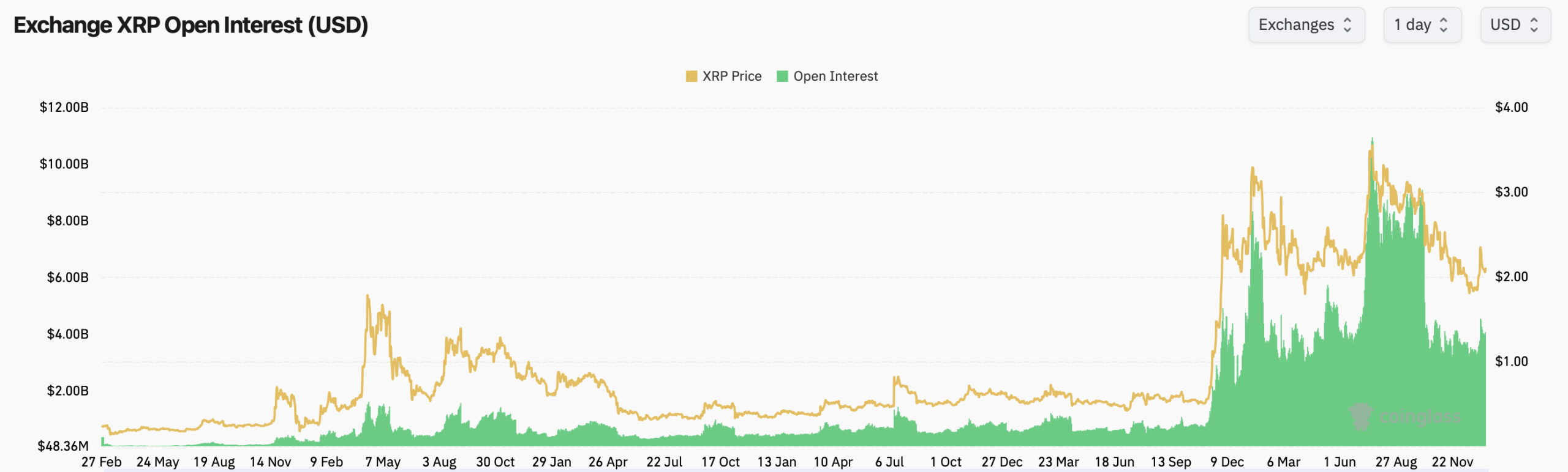火曜日にXRPのデリバティブ市場は再び活気を取り戻し、先物の未決済建玉は取引所全体で$4.08十億に達し、スポット価格は1コインあたり$2.11のままでした。この積み上げは、トレーダーが最近の動きを追随するのではなく、追い風を期待してポジションを取っていることを示唆しています。