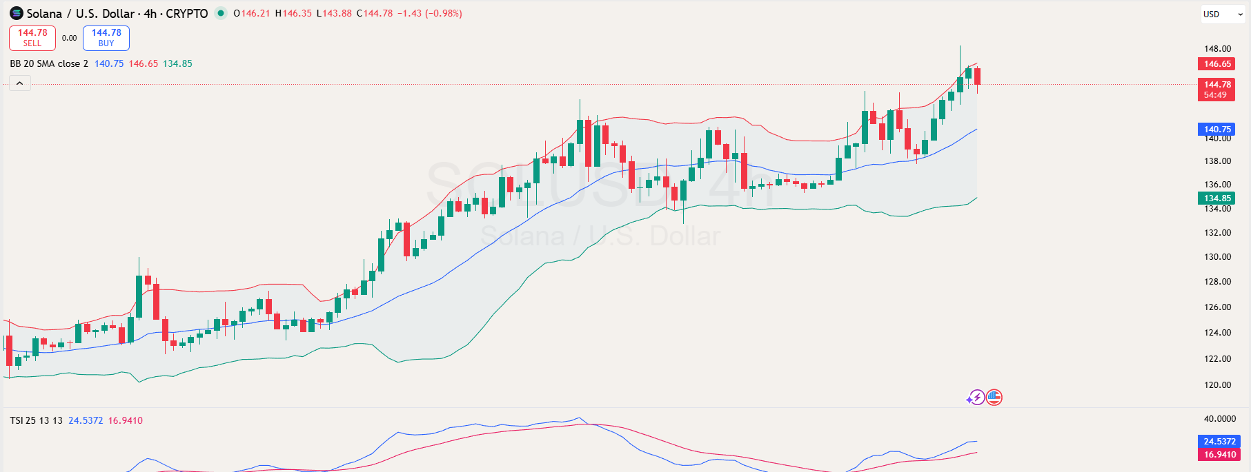 4時間のTradingViewチャートは、ソラナが最近$146.5付近の上部ボリンジャーバンドで反発を受けたことを示しており、これにより現在の強気の勢いは勢いを失いつつある可能性があります。ただし、ボリンジャーバンドは市場のボラティリティが高まっていることを示しており、上部バンドでの反発は潜在的な抵抗を示しています。