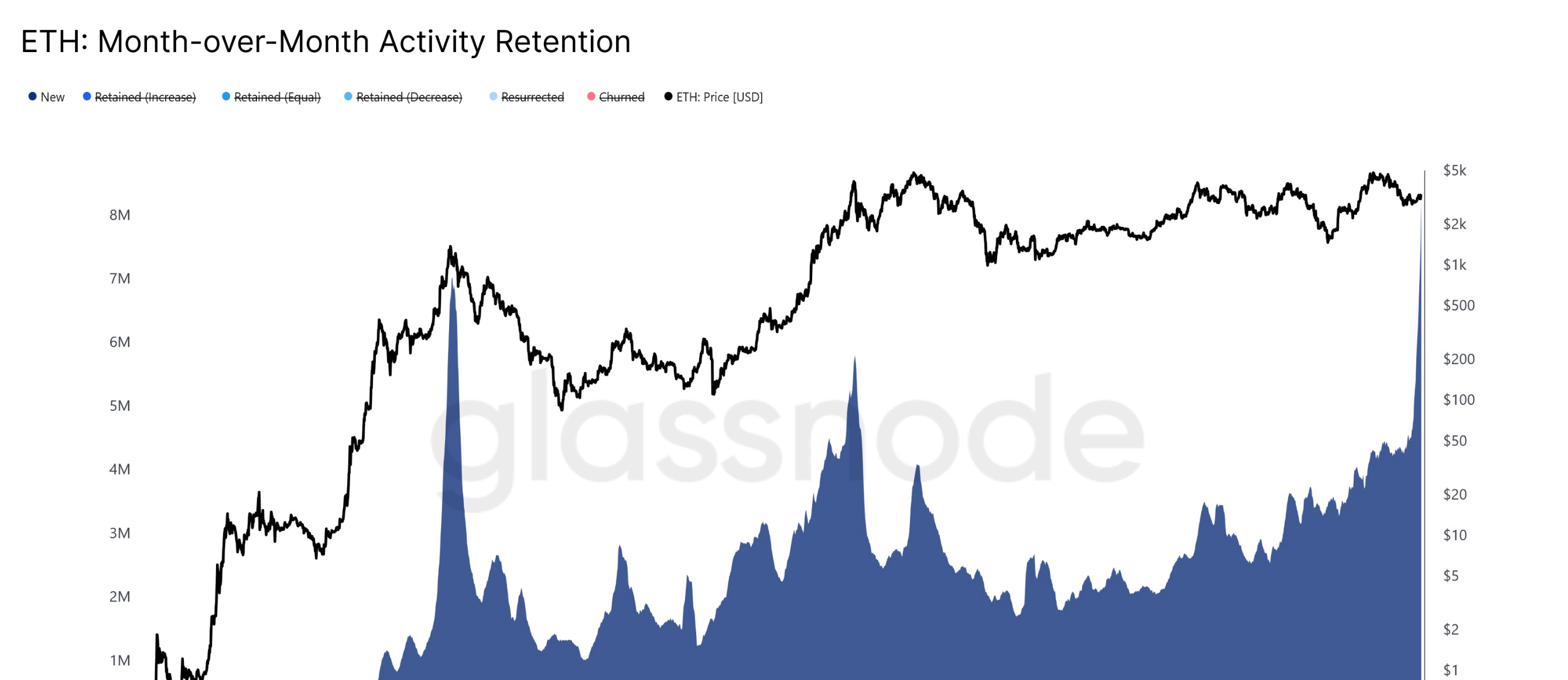 イーサリアムの月次活動維持率に関するデータは、「新規」層に顕著な増加を示しています — これは一定期間内にブロックチェーン上で初めて記録されたやり取りを行ったウォレットを追跡する指標です。