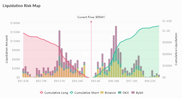 • $95,500上方空头清算级联效应明显,突破可能引发逼空