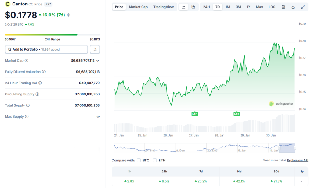Coingeckoこのパフォーマンスは、ビットコイン(BTC)が7.2%下落し、イーサリアムが6.2%下落している時期に見られ、Cantonは独自の道を歩んでいます。
