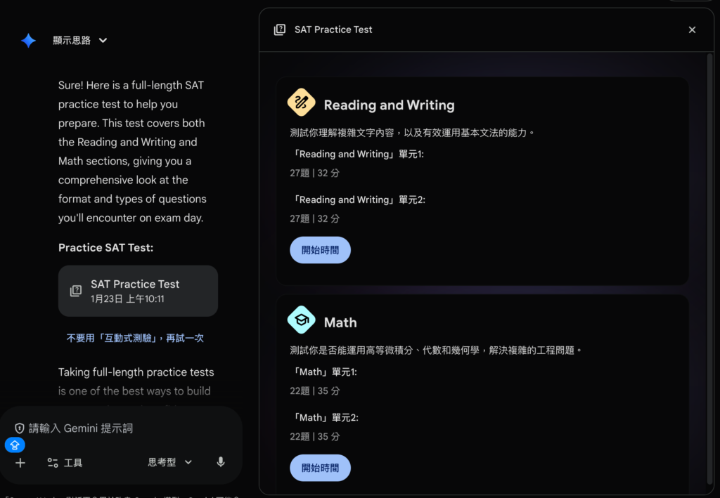 Google 近日宣布推出由 Gemini 驅動的免費 SAT 模擬考試服務。使用方式很簡單,只需在 Gemini 中輸入「I want to take a practice SAT test」,即可獲得免費模擬試題。(筆者嘗試後卻時可用)