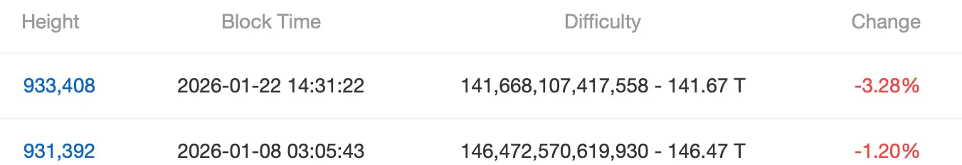 So far, 2026 has seen two difficulty changes, and both of them were reductions. The last difficulty change was a drop of 1.20% which was preceded by a modest 0.04% increase last year on Dec. 24.