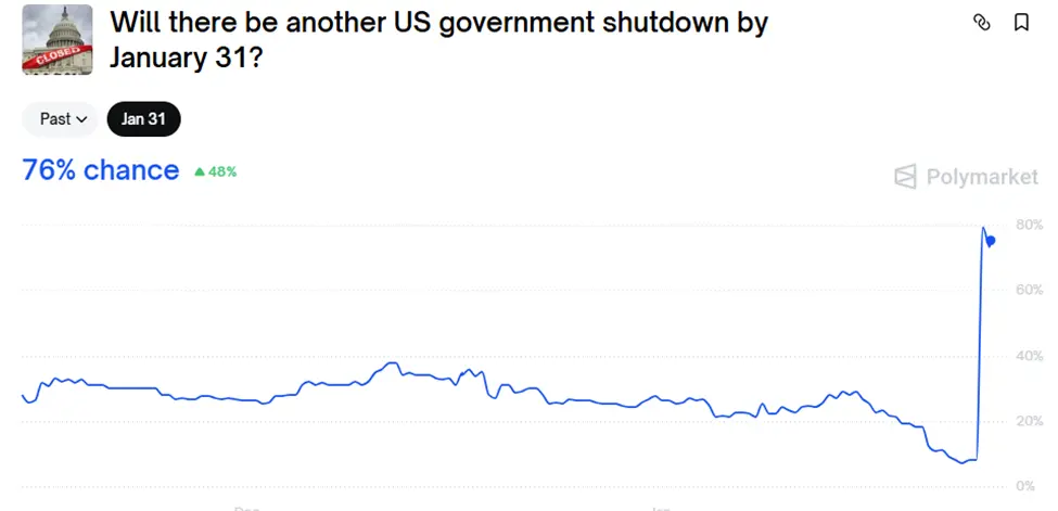 Indeed, Polymarket bettors see a similar outcome, wagering a 76% probability that there will be another US government shutdown by January 31.