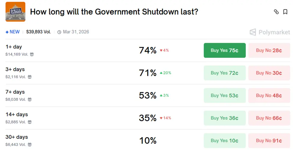 US Policymaker Deadlock Pushes Shutdown Odds on Polymarket Higher